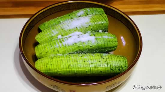 2.切好的黄瓜放入盆中,加入2勺盐,用手将盐搓匀,然后放一边腌制一个小时,腌出里面的水分,这一步是黄瓜爽脆的关键。