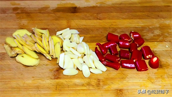 4.再准备一点配料:姜切片、蒜切片、红辣椒切段,量根据自己的喜好,喜欢就多放点,我不喜欢吃姜却喜欢吃蒜,所以每次都会多放一些蒜片,不能吃辣,也可以不放红辣椒。