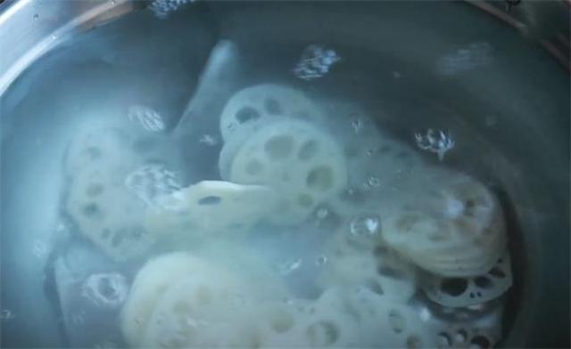 3.锅里水烧开后,再往锅里加点醋进去,然后把莲藕放进开水锅里焯水,莲藕烫15秒左右就可以,再控水捞出来过下凉水,这样莲藕的口感才会更加的清脆爽口。