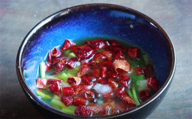 4.接下来准备一小块削皮的生姜,全部切碎成生姜末,切好的生姜末装入碗里面,准备一小把洗干净的小葱,切成稍微长一些的段,切好的小葱也装入碗里面,碗里再加入一把干辣椒段,然后泼入少量热好的花椒油进去,加入一小勺的盐,再加入一勺白糖,然后再加入稍微多一点的米醋进去,再滴入几滴香油,用筷子搅拌均匀,咱们这个料汁就调好了。