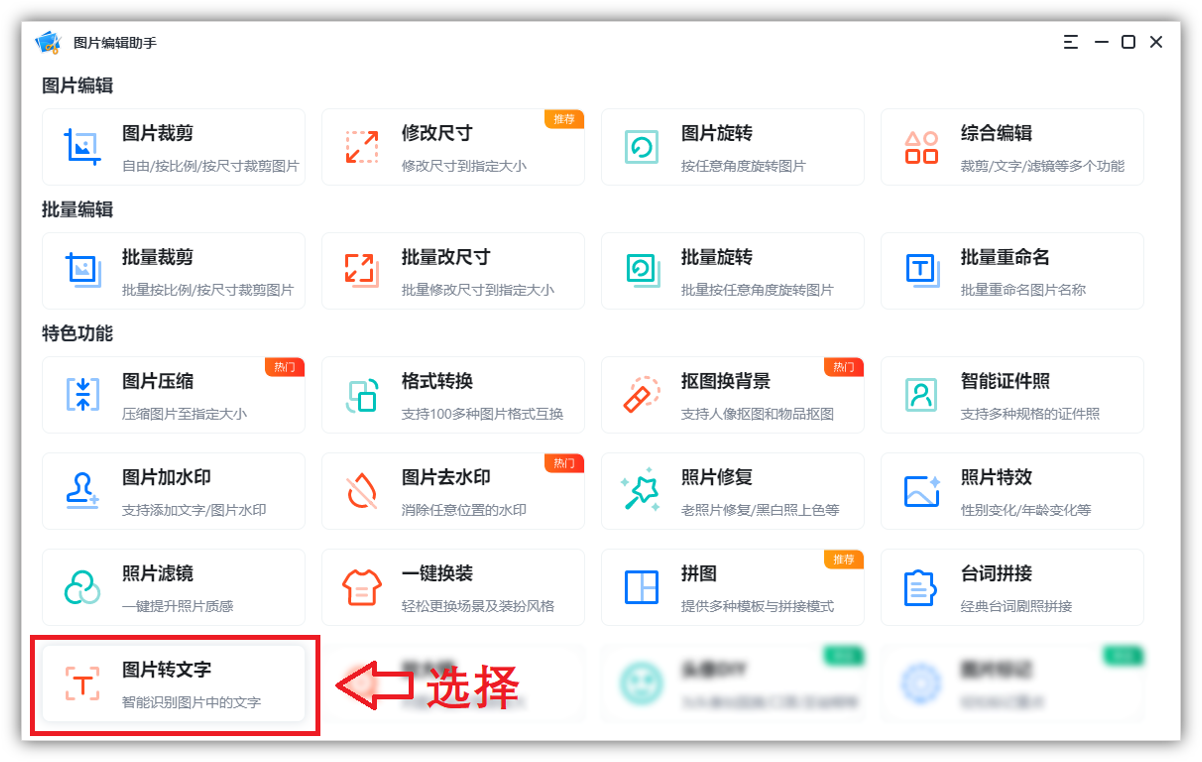 还有一种简单粗暴的方法,就是将文档内容全部截图,然后打开图片编辑助手,左下角有个【图片转文字】功能,点击使用它。