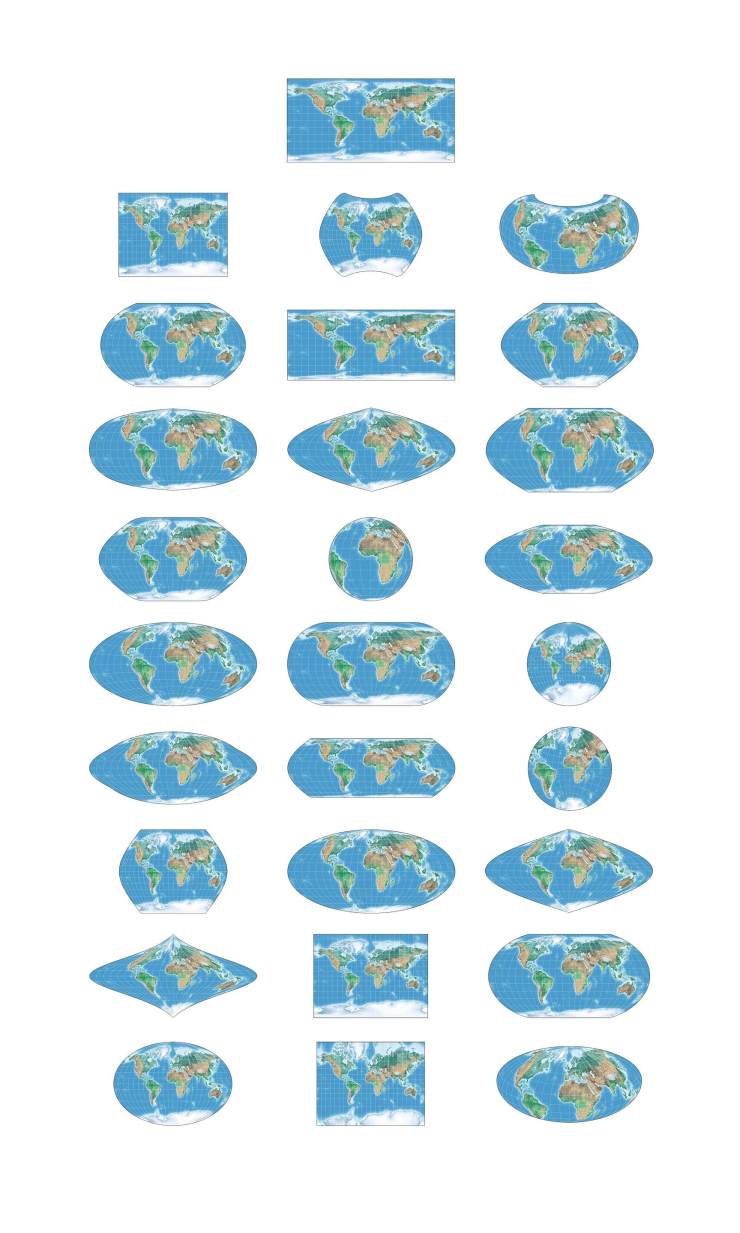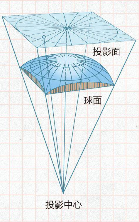 透视投影:如果绘制较大区域的地图,要考虑地球表面的曲率,通常使用透视投影法。假设有一处投影中心(光源),把地表的样子投影到一个平面或者能“展开”成平面的曲面上。