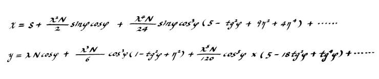 我国常用地图多采用“高斯-克吕格投影”,这是它的计算公式。