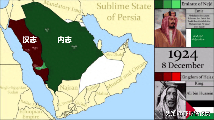 1925年,拥有英法先进装备的内志王国灭亡汉志。汉志王国的哈希姆家族流亡海外。