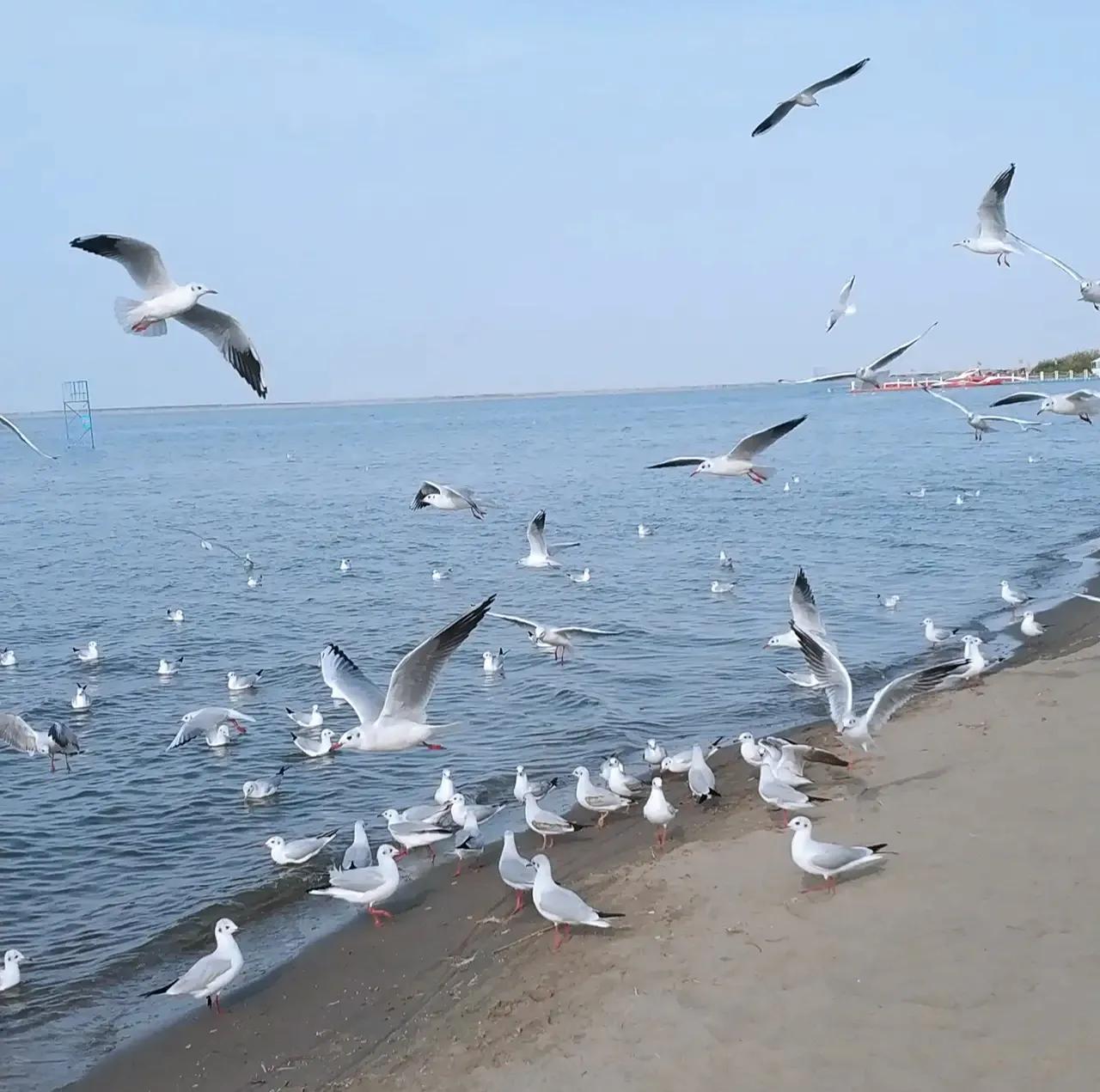 从空中俯瞰金沙滩,蔚蓝的湖水和金色的沙滩、绿意盎然的芦苇,形成了强烈的色彩碰撞,像是一幅浓烈的油画。很多外地人初次来到金沙滩都想不到新疆还有这样的风景,一边是粗犷恢宏的戈壁沙漠,另一边是蔚蓝色的湖泊,还有绵延2公里的金色沙滩。到了傍晚时分,夕阳西下,天边的晚霞映照着湖面上翩翩归巢的水鸟,这场景跟海边的日落一样。