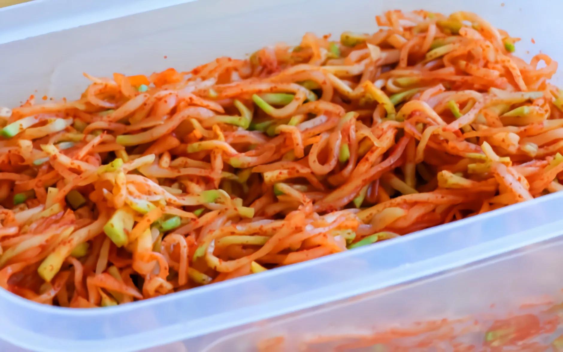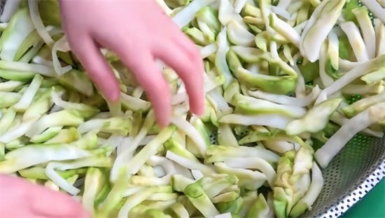 2、然后把菜头切成细丝,然后全部放进盒子里面,加入两大勺的食用盐抓拌均匀,腌制三到四个小时,杀一下水分,菜头软软的,把多余的水分倒掉,有很多水分出来就可以啦,然后清洗一下,然后准备一个纱布袋,把青菜头装进纱布里,接着盆里放入一个蒸架,把菜头放上去。上面再用一个重物压紧,要压两天左右。