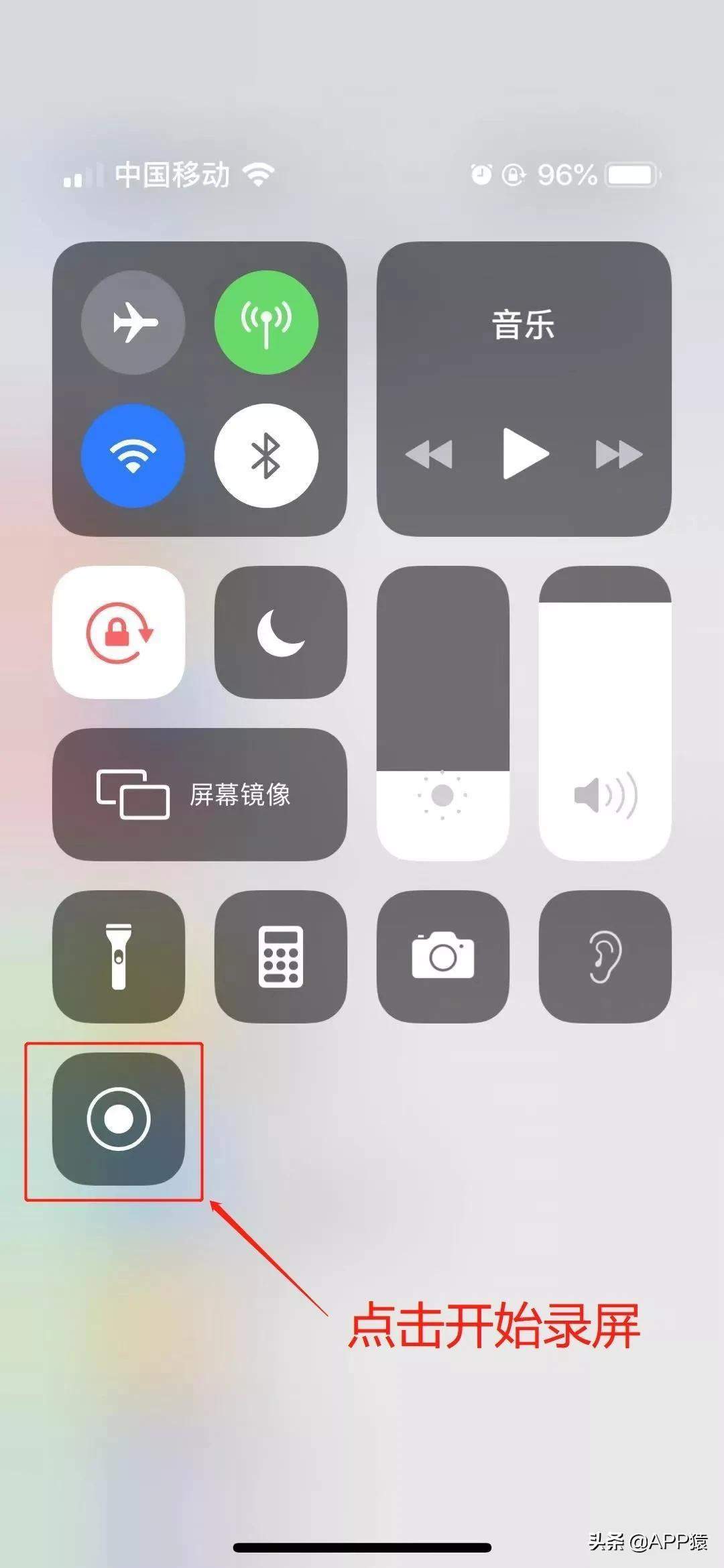 3、滑动唤出系统快捷功能栏,我们也可以称之为控制中。找到这个圆形按钮式的功能,点击即可开始录屏了。录屏时会倒计时3秒,在3秒内你可以把苹果手机界面的内容调整至你想录屏的内容界面,接下来你的一切操作都会被录制。