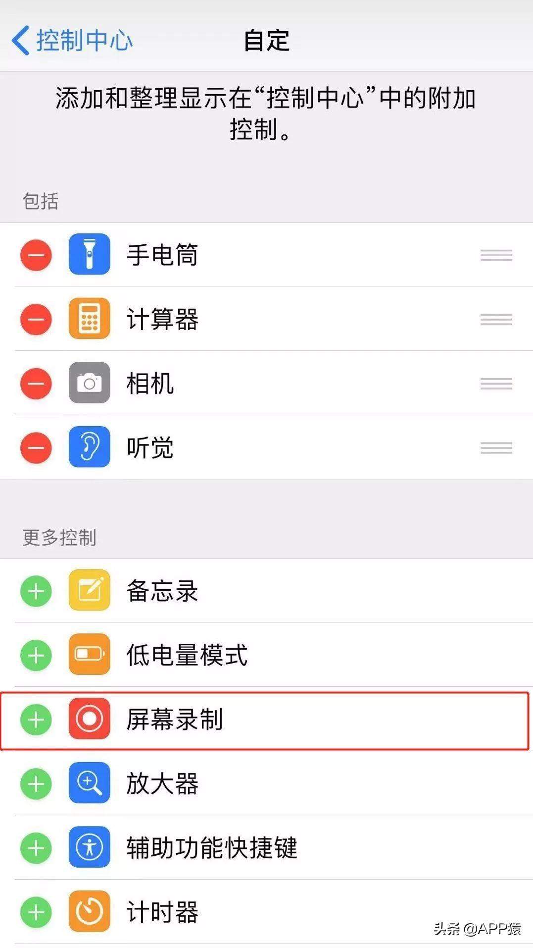 2、在「自定控制」里边,有低电量模式,放大器,备忘录,计算器等等好用的小功能,大家可以根据自己的需求进行添加。我们找到「屏幕录制」功能后,点击左边绿色的+号,就完成添加了。