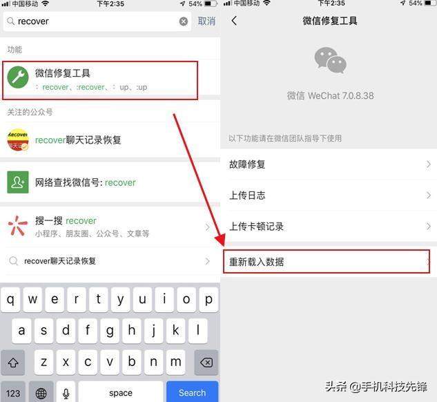 其中最简单的方法就是,微信自带的recover恢复功能。我们只需在搜索框输入【recover】,然后点击【微信修复工具】–【重新载入数据】即可。非常遗憾的是,这个方法只适用于苹果手机。