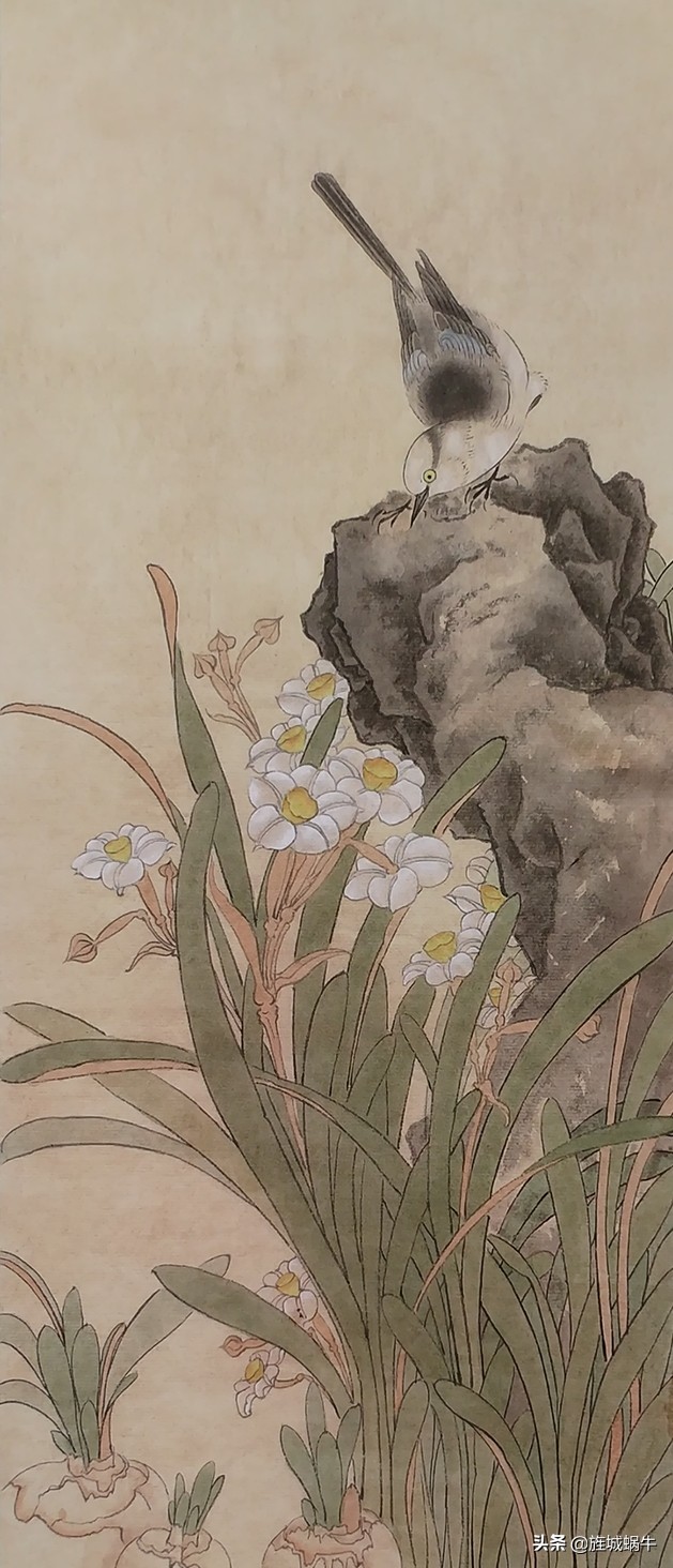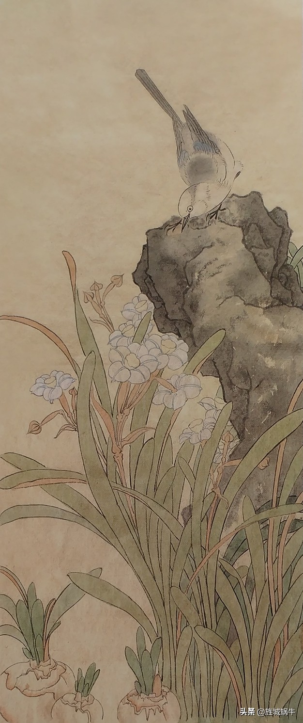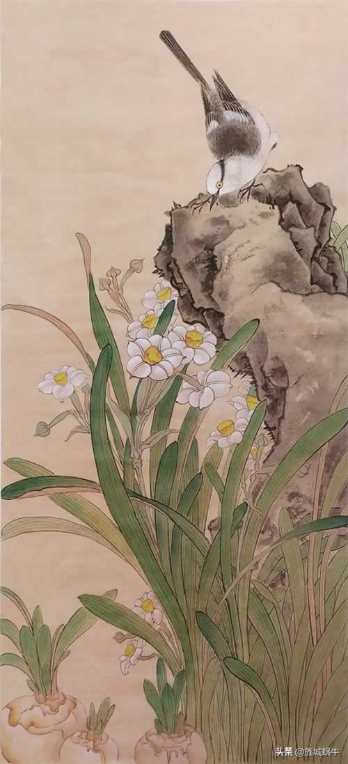 第五步:以浓粉黄点出水仙花花蕊;以草绿勾画水仙叶子的正面筋脉,以赭石勾出水仙叶子的反面筋脉,注意用线要细;用浓白粉对鹡鸰鸟的头部、腹部、翅膀中的白色羽毛进行丝毛;以花青调少许墨,适当加重配景石头的颜色,增加层次感,衬托水仙花和鹡鸰鸟的白色部位。最后,题款,盖章。