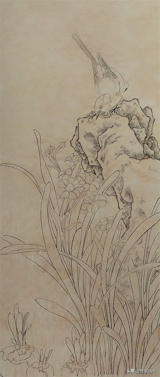 第一步:水仙花秀美清丽,用中锋长线勾出其茎叶秀逸之姿,以淡墨细笔勾勒水仙花头;鹡鸰鸟灵动机警,造型精巧,用笔要与精神吻合;配景石头应以稍干涩的粗笔勾勒,并略带皴擦。