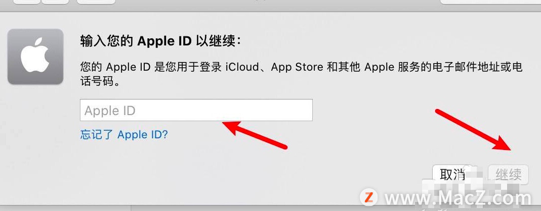 4、在窗口中输入Apple ID,然后点击下边的“