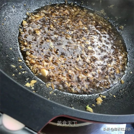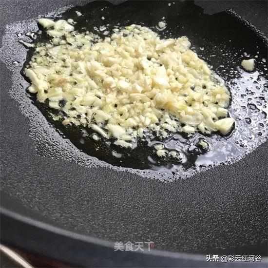 6. 锅中入油烧热放入蒜末炒出香味。