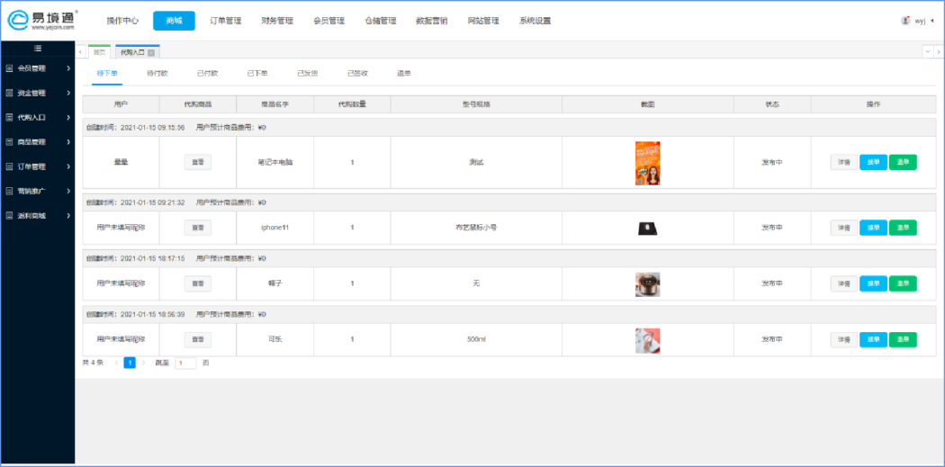 易境通代购系统分为PC端和移动端,用户可以直接在手机端下单并填写代购商品的信息,支持在线运费预估,后台接单之后会设置对应的费用信息让客户进行付款,支持管理后台添加订单、打印采购清单以及退换货操作管理。