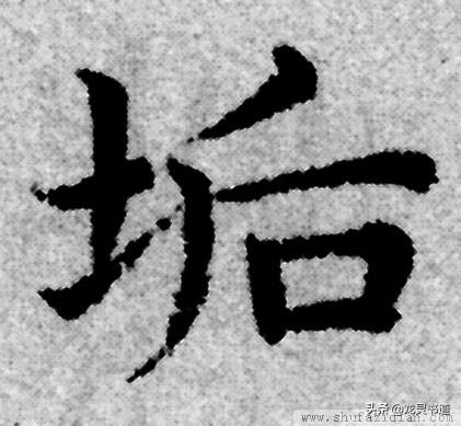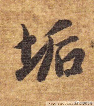 左部“土”字旁不可写宽,抗肩,靠上。首横大抗肩,不要写长;竖笔高起,从横画偏右部穿过,竖身上粗下细;提笔起笔略靠左,注意角度,过竖笔即收,以让右部。