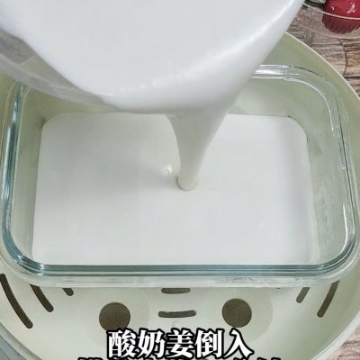 6、6、蒸锅内放入500ml容量的玻璃碗,水开后倒入酸奶生熟浆蒸15分钟左右,牙签插进去没有生的糊带出来就是熟了。