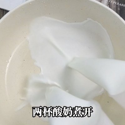 3、3、锅中倒入200ml酸奶,煮开后熄火。 (我买的酸奶是甜的,如果是无糖酸奶在这一步要加糖50~100g一起煮。)