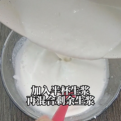 5、5、将熟浆倒回剩余生浆中,同样也是边倒边迅速搅拌均匀,得到酸奶生熟浆。