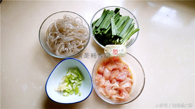 2、瘦肉切丝用少许生抽和淀粉腌制十分钟;葱姜切末,韭菜切段;粉条煮软,备用