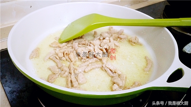3、锅内放少许食油,油7成热时下入腌制好的瘦肉丝滑炒至变色,捞出备用