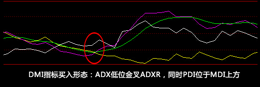 当ADX和ADXR在20以下低位金叉时,如果PDI位于从MDI上方,就是看涨买入信号。