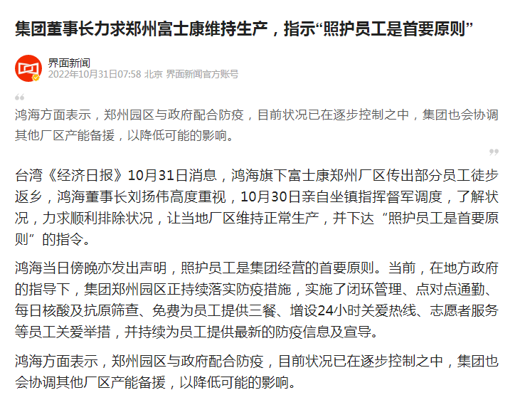 政府更是对富士康的发展倾注了大量心血,疫情这几年,点对点帮助招工,全力协助抗疫,尽最大可能确保生产生活资料供应不受疫情影响,很多方面政府都尽了最大的努力。然而,会不会因为努力就可以确保万无一失,不出现任何问题呢,答案是显而易见的。
