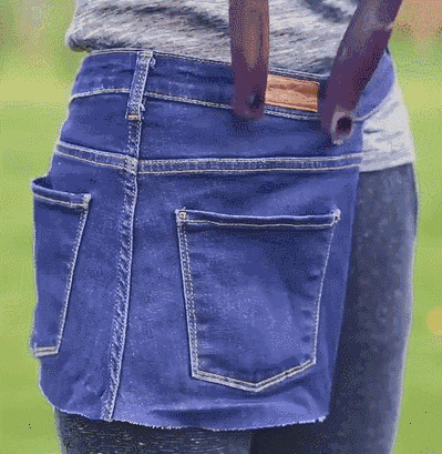 把牛仔裤沿着腰围部分剪一剪,留下一口袋部分,一个简单的工具包就做好了,还不需要缝线。