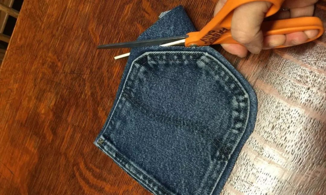 牛仔裤口袋剪一剪,轻松解决这个问题。把牛仔裤的口袋剪下来,然后留一下一小块当作挂绳。