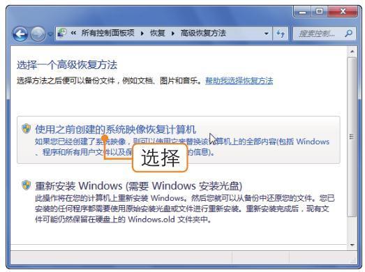 在弹出的窗口中选择“使用之前创建的系统映像恢复计算机”选项,如下图所示。