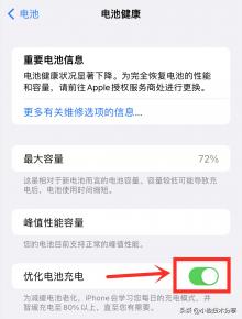 进入【电池健康】界面之后,我们把最下面的【优化电池充电】开关打开,打开这个开关之后,手机就会学习我们的充电方式,在充电时,可以有效保护我们的电池,延长电池使用寿命,因此我们在充电时候,就不会出现发热发烫的现象了!