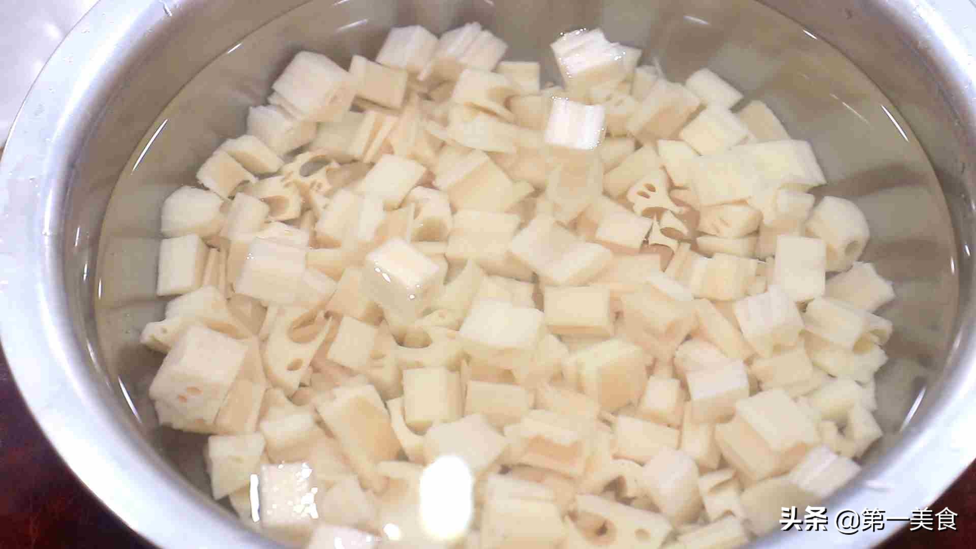 3.下面我们把莲藕焯一下水,锅内烧水大火烧开以后,把莲藕控干水分放入锅中,快速汆水30秒钟,莲藕断生以后立即倒出,用清水冲洗过凉以免在余温下回软。
