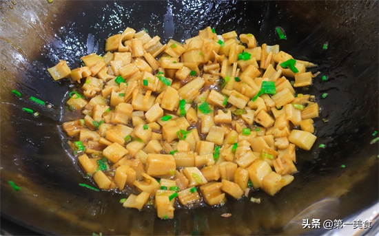 4.把锅烧热加入半勺植物油,油温五成热时放入葱花爆香,倒入控过水分的莲藕翻炒几下,把料汁搅拌一下倒入锅中转大火收汁,让料汁的味道充分融入到莲藕里面,出锅前撒上葱花美味即成。