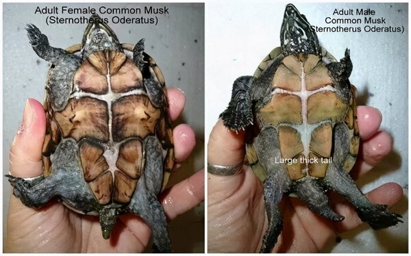 雄性麝香龟在背甲长5cm左右开始出现发情现象,8cm以上达到性成熟,雌性需要4-5年时间,9cm左右发情。雄龟尾巴粗长,泄殖口离尾巴基部更远;雌龟尾巴细短,泄殖口离尾巴基部更近。麝香龟的交配季节主要集中在春秋季,其他时候偶尔也会见到交配的现象发生,麝香龟的求偶是比较简单粗暴的,公龟会直接爬到母龟背上开始交配。春季交配后不久雌龟就会产蛋,麝香是一种比较高产的蛋龟,通常一窝3-6个,一年3-5窝。