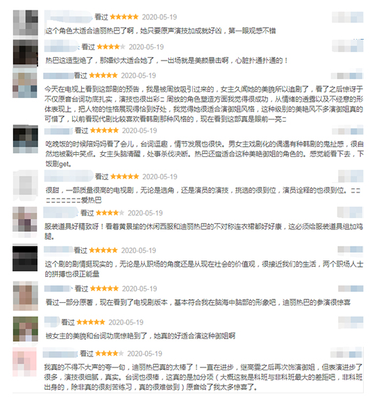 其中大部分网友对该剧给与好评,表示“这个剧的剧情挺现实的,无论是从职场的角度还是从现在社会的价值观,很接近我们的生活,两个职场人士的拼搏也很正能量”、“很甜,一部质量很高的电视剧,无论是选角,还是演员的演技,挑选的很到位,演员诠释的也很到位”、“台词逗趣,情节发展也很快。男女主戏剧化的偶遇有种韩剧的鬼扯感,很自然地被戳中笑点”、“服装道具好精致呀!看着黄景瑜的休闲西服和迪丽热巴的不对称连衣裙都好好康,这必须给服装道具组加鸡腿。”