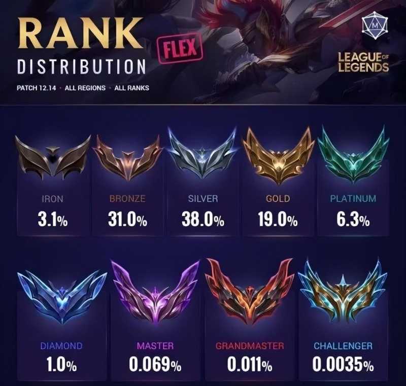 英雄联盟段位级别排列(LOL最新游戏段位图,王者占0.0035%,70%的菜鸟集中在两个段位)