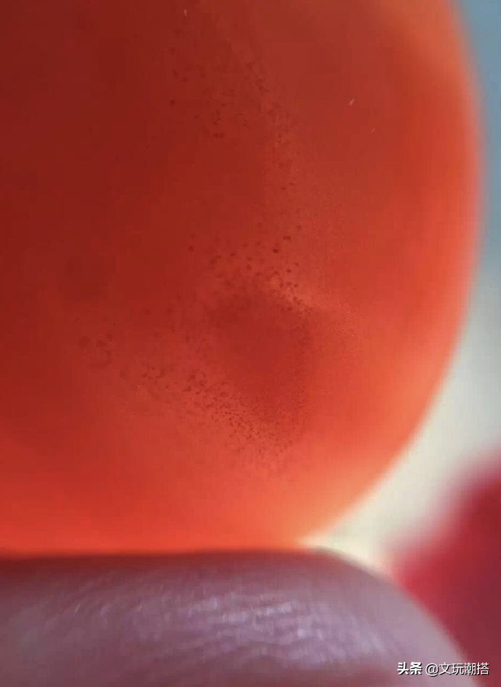 南红既然具备玉石特征,那么打光是一定会透光的,只是透光的程度和打光的感受是不一样的。真正的南红玛瑙打光后是可以看到满满的朱砂点,而且由内到外都十分通透,朱砂点就像点点繁星一般,十分好分辨,一个手电筒就搞定了!