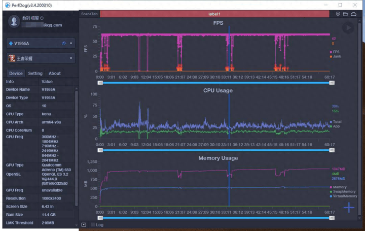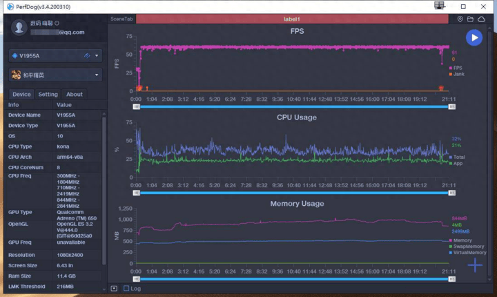 从上面的测试图就可以看出,在运行这款游戏时机器的帧率、CPU 运行状态整体趋势特别平稳,并没有什么太大的起伏。