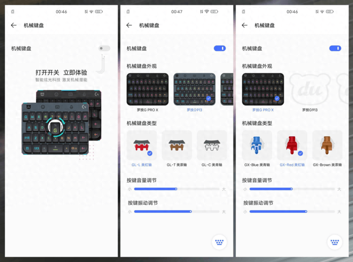 ▲ iQOO 3 采用了一颗 X 轴线性马达,所以在日常使用这款手机时使用户可以体验到模拟真实机械键盘的打字体验,目前 iQOO 与罗技合作,在手机系统内提供了罗技 G Pro X.,罗技 G913,罗技 G512,罗技 G910 四款不同风格的真实机械键盘外观皮肤,而且在轴体方面有类青轴,类红轴,类茶轴三种轴体可以选择,用户还可以通过调整按键音量、震动来获得更加更贴合真实机械键盘的打字效果。