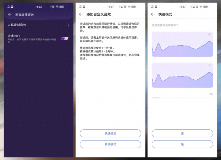 ▲在手机的游戏空间内可以对游戏音质音效进行设置,它专门为用户提供了一个人耳定制音效页面,可以测试用户的听力范围并进行补偿,从而找到最适合自己的音效。之后再开启游戏 Hi-Fi 模式,插入耳机之后游戏背景音将支持 HIFI 音质,就可以戴上耳机畅快的玩游戏了!