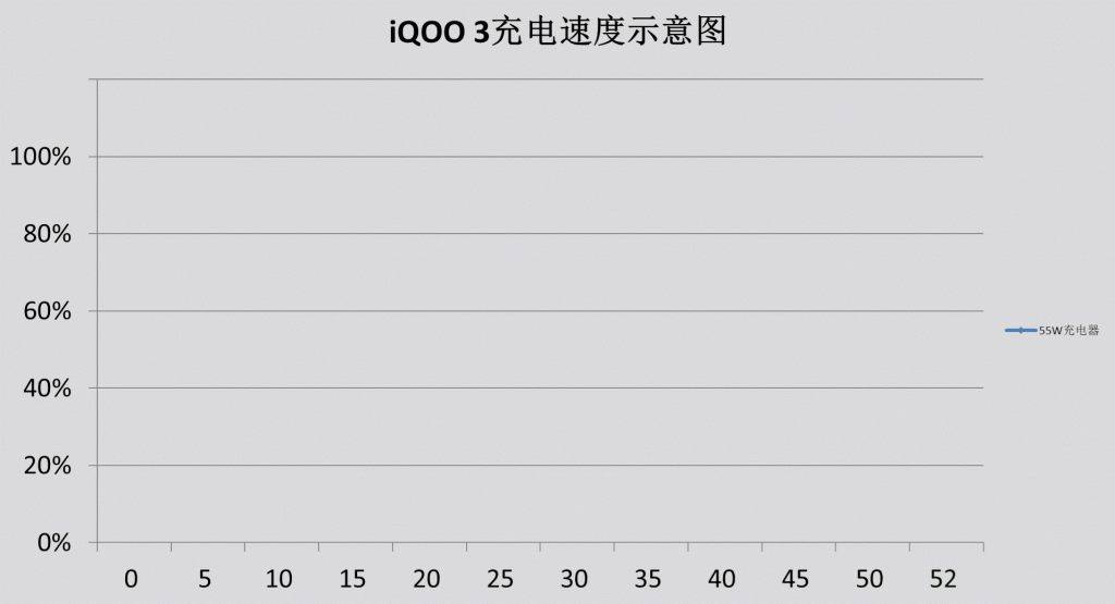 ▲首先测试的是这款手机的充电速度,使用的是标配的 55W 超级闪充,从上面这个充电示意图可以看到手机电量从 0 充至 100% 共花费了 52 分钟的时间,这个充电速度可以说相当给力了。此外,从图中还可以看到将手机电量充至 50% 时,仅花费了 15 分钟时间,这个数据跟官方标注的基本是一致的。