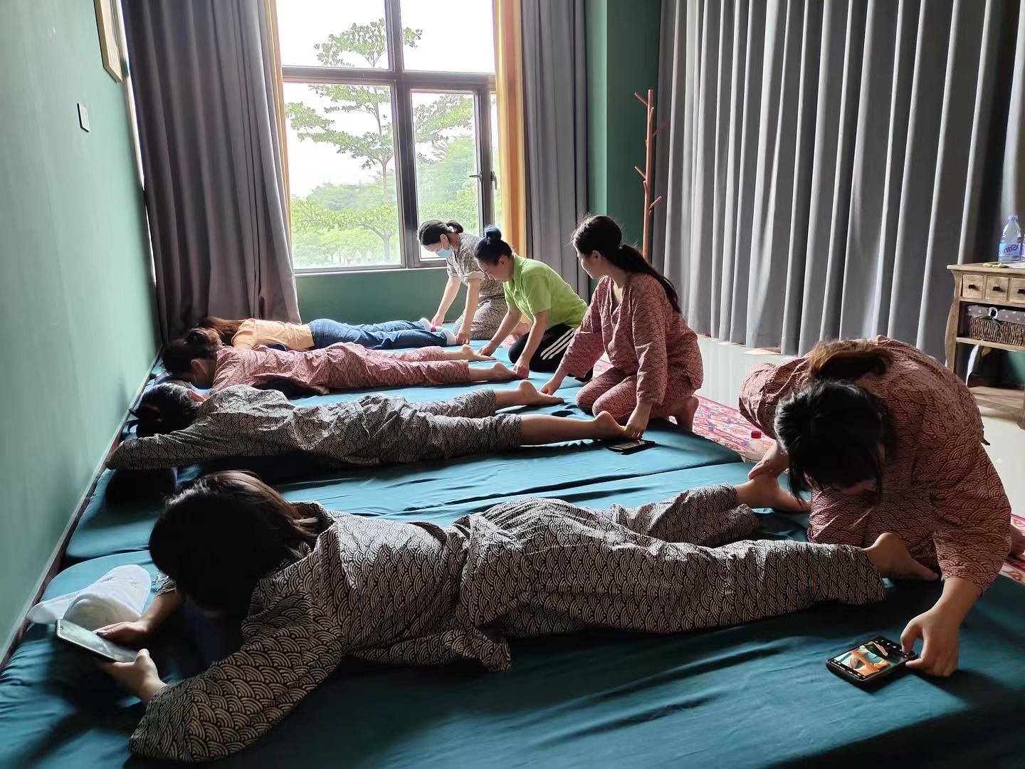 前台接待人员领着,进入按摩室,更衣,在轻音乐中,等候按摩师。