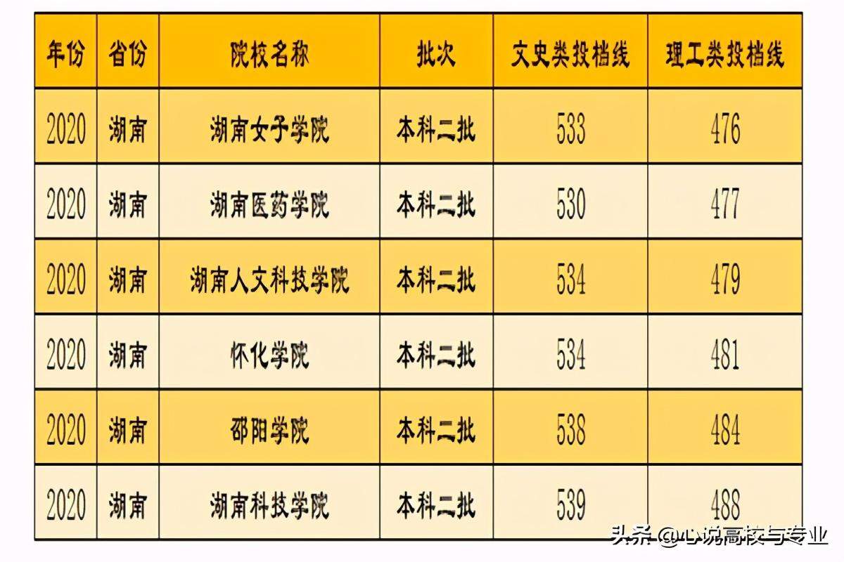 在湖南省,要说最容易考上的就数下面这6所高校了,分别是湖南女子学院、湖南医药学院、湖南人文科技学院、怀化学院、邵阳学院和湖南科技学院,这6所高校都是在本科二批进行招生的,并且,文、理科的录取分数也是湖南省所有公办本科高校中最低的。2020年,这6所高校在湖南省的具体录取分数是这样的