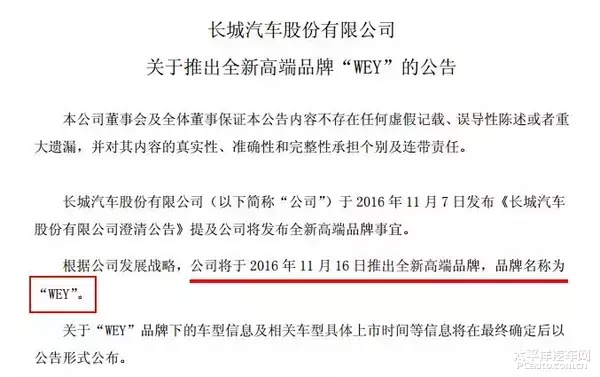 11月10日,长城董事会官方发布公告称,即将在11月16日推出的全新高端品牌名为“WEY”,“WEY”品牌旗下车型信息和车型上市日期等将在确定后公布。