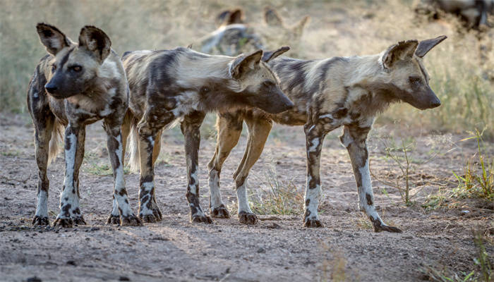 非洲野犬(学名:Lycaon pictus):体长100厘米,尾长30-45厘米,体重17-36千克。毛色较杂乱,包括黑色、黄色和白色等,每个个体毛色斑纹均不相同。前肢无爪。前臼齿较大,可磨碎大型骨头,类似鬣狗。群居,通过叫声进行定位。采取群体合作方式猎杀中型有蹄动物,追击时速可达45千米。全年可繁殖,多为雨季,每胎产2-19仔,通常10仔,幼仔一般在其他动物(比如土狼)的巢穴中出身,12-18个月性成熟。