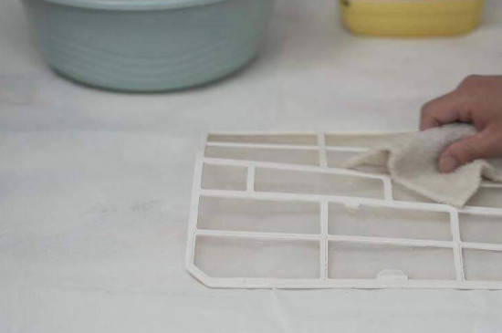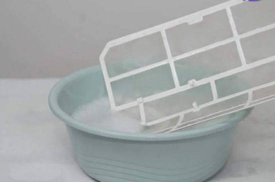 先将空调机内的过滤网拿下来,蘸点洗洁精,用刷子刷新干净,用清水冲洗。